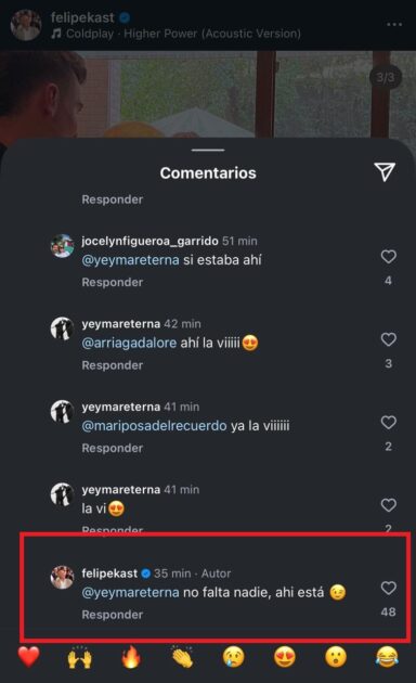 “¿Y Pamela?”; “La Pame se quiso esconder o pasar piola, pero se ve igual”; “Faltó la Pamela”, fueron algunos de los comentarios. Sin embargo, Felipe se encargó de afirmar que sí estaba la Fiera. “No falta nadie, ahí está (Pamela)”, zanjó.