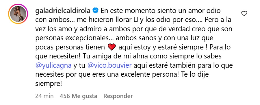 Por otro lado, Gala, amiga muy cercana de ambos, no quiso quedar fuera y le manifestó su cariño y apoyo a la trasandina.