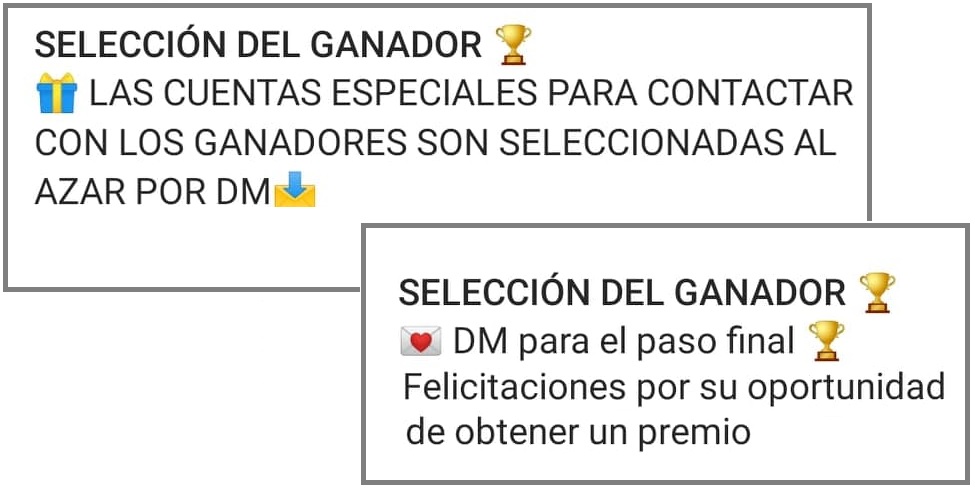 La base de la estafa es colgarse de un concurso. Los responsables de esto buscan perfiles que estén realizando sorteos para aumentar seguidores y premiar a sus clientes. Al “clonar” la cuenta, comienzan a mandarles mensajes a los usuarios que participan, diciéndoles que han sido seleccionados como ganadores.