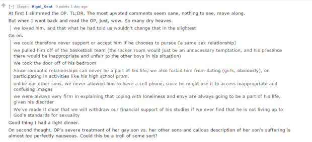 Uno de las respuestas a la preocupada madre fue esta: “Sin importar tu punto de vista sobre la homosexualidad, lo que le estás haciendo a tu hijo es abusivo. Le estás enseñando que es inherentemente malo. Si tu cura ha aprobado esto, necesitas un mejor consejero, preferentemente de un profesional de la salud mental legítimo y con licencia. No porque él sea gay, sino por tener padres que decidieron tratarlo como un peligroso criminal y no como un chico vulnerable”.