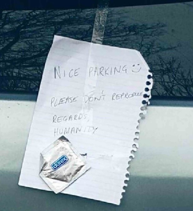 Al parecer, esta situación enojó bastante a un transeúnte o quizá a otro conductor, el que decidió dejarle una “amorosa” nota junto a un preservativo, pegado en su vidrio trasero, según consignó el medio inglés Metro.co.uk.