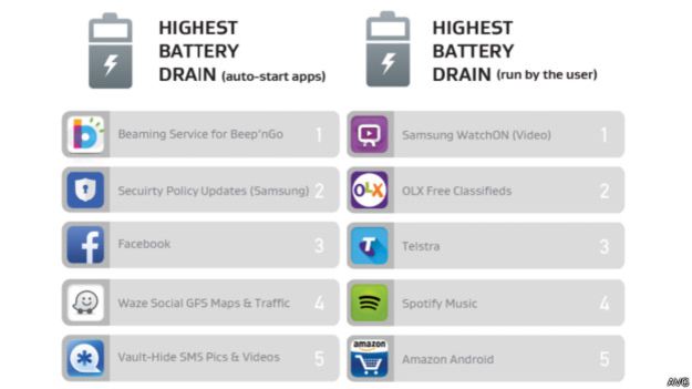 Cabe señalar que la compañía surcoreana Samsung, lidera ambas listas con servicios como el Samsung Beaming Service que viene pre-instalado en los smartphones modelo Galaxy, y la herramienta de actualizaciones de seguridad de la misma empresa. Y en cuanto a la aplicación que más batería consume al usarla encontramos a Samsung Watch On, que se utiliza como control remoto para el televisor.