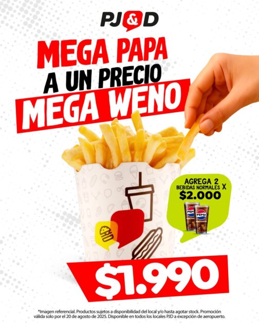 Pedro, Juan y Diego ofrece la “Mega Papa” a $1.990 y, por $2.000 adicionales, la opción de sumar dos bebidas de tamaño normal.