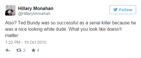 “¿Y qué? Ted Bundy fue un exitoso asesino en serie porque era un tipo agradable de apariencia. Tu aspecto no importa”.