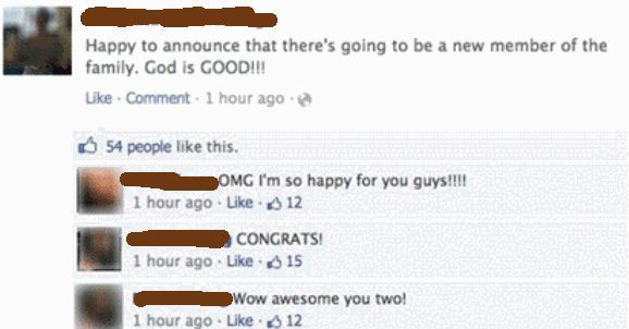 “Feliz de anunciar que viene un nuevo miembro a la familia. Dios es bueno”, publicó la usuario. De inmediato sus contactos comenzaron a felicitar a la futura madre con mensajes como los que presentamos en la siguiente captura: