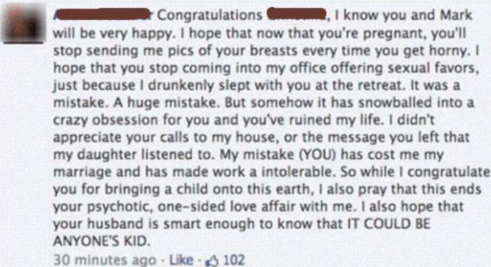 “Felicidades. Sé que tú y Mark son muy felices. Espero que ahora que estás embarazada, dejes de mandarme fotos de tus tet** cada vez que estás caliente. Espero también que dejes de venir a mi oficina ofreciéndome sexo sólo porque una noche de borrachera me acosté contigo. Fue un error. Eso te llevó a obsesionarte conmigo y me has arruinado la vida. No me gustan las llamadas a mi casa ni los mensajes que me dejas que mi hija tiene que escuchar. Mi error (TÚ) me ha costado mi matrimonio, y el trabajo se hace insoportable. Así que, mientras aprovecho para felicitarte por el bebé que estás trayendo al mundo, también rezo para que sea el final de tu psicótico affaire conmigo. También espero que tu marido sea suficientemente inteligente para saber que PUEDE SER HIJO DE OTRO”, escribió el usuario sin filtros.
