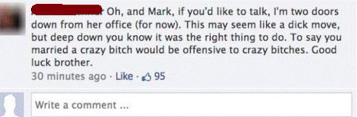 “Oh, Mark, si quieres hablar conmigo estoy dos puertas más allá de la oficina de tu mujer (por ahora). Quizás éste ha sido un acto idiota, pero en el fondo sabes que era lo mejor que podía hacer. Si dijera que te has casado con una ‘pu** loca’ sería ofensivo par alas put** locas. Buena suerte, hermano”.