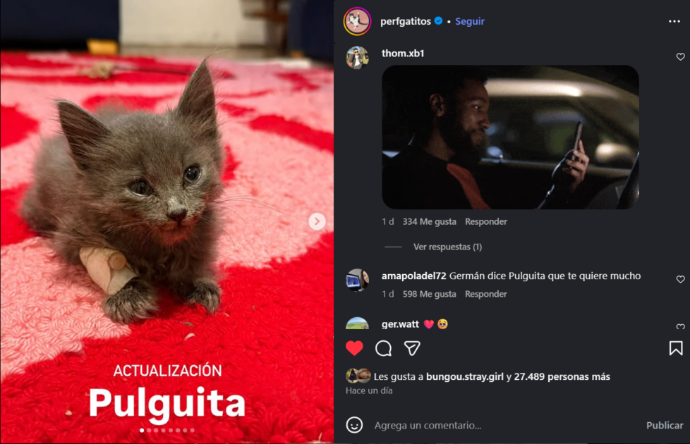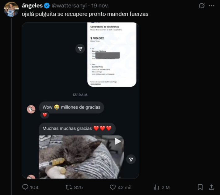 Pero la historia no terminó ahí. En otra captura, el joven mostró el comprobante de la transferencia y la respuesta del refugio @perfgatitos, desde donde le enviaron un mensaje lleno de cariño: “Wow, millones de gracias. Muchas muchas gracias”, acompañado de emojis de corazones y un tierno video de Pulguita, un gatito enfermo que actualmente está bajo su cuidado.