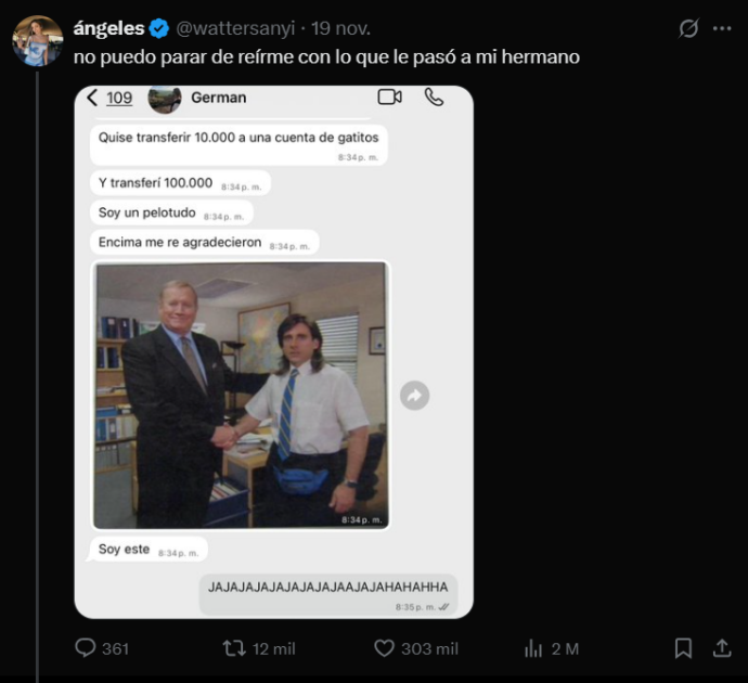 La hermana de Germán fue quien relató lo ocurrido, acompañando su publicación con capturas de pantalla de WhatsApp y el comentario: “No puedo parar de reírme con lo que le pasó a mi hermano”.