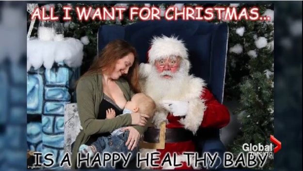 Rebecca Dunbar publicó una imagen donde aparece ella amamantando a su bebé, mientras está sentada en el regazo de un Viejo Pascuero.