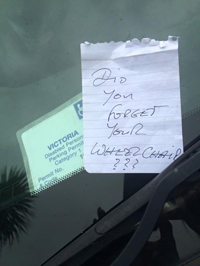Sin embargo, alguien que parece haberla visto descender del auto sin una aparente “discapacidad”, le dejó una nota anónima que dejó bastante afectada a Justine. El mensaje decía: “¿Olvidaste tu silla de ruedas???“.