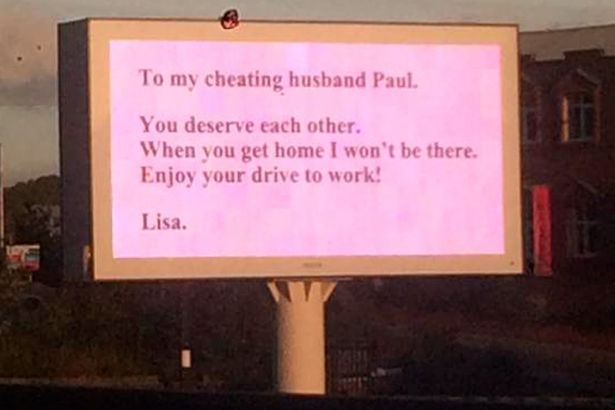 Una mujer conocida como Lisa, utilizó un letrero publicitario electrónico ubicado en una carretera de Sheffield, poblado de la ciudad de Yorkshire, Inglaterra, para comunicarle a Paul, su marido, que había descubierto su infidelidad.