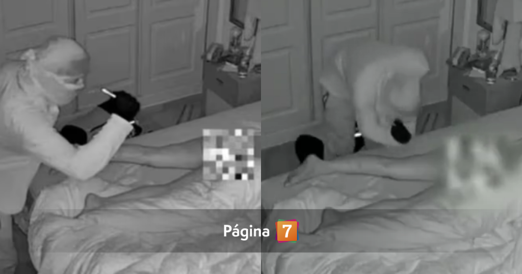 En los registros divulgados se observa cómo el delincuente entra ocho veces al dormitorio e inspecciona con una linterna al cuerpo de la mujer.