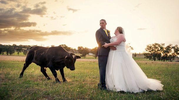 La escena era la ideal: un bello atardecer sobre el campo, verde césped y árboles. Pero lo que no estaba considerado en la toma, fue un extraño toro que apareció de la nada para molestar al novio.