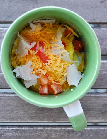 3.- Echa dos cucharadas de salsa de tomates en el fondo de la taza. Ponle una lámina de pasta. Agrega la mezcla de verduras con condimentos, luego dos cucharaditas de queso y agrega pasta. Continúa armando tu lasaña así hasta alcanzar el tope, que debe terminar en una lámina de pasta, a la cual le echarás un poco más de queso.