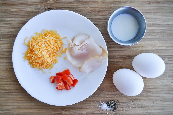 Necesitas 2 huevos, 2 cucharadas de leche y escoger tus agregados: queso, cebolla en cubos, jamón, etc. Además, sal y pimienta