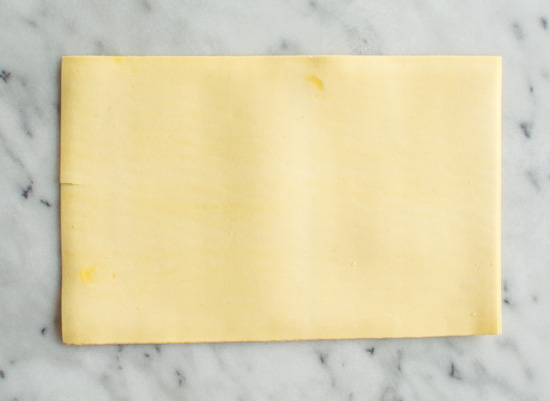 1.- Coge la lámina de lasaña fresca y córtala en cuatro. Ponla en un bol para microondas y hecha agua muy caliente, hasta que la cubra por completo. Cubre el bol con filmito y deja un par de agujeros para que ventile. Mételo al microondas por un minuto.