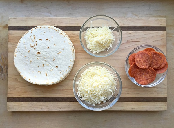 Masas de burritos, queso rayado o granulado, salsa de tomate y láminas de salame. Puedes usar oréganos, albahaca o pimienta para condimentar, o jugar a agregar otras verduras como tomates y pimientos.