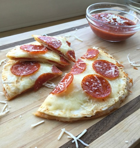 1.- Tiende una masa de tortilla sobre un plato para microondas y agrégale el queso y salsa de tomate. Tapa con otra masa de tortilla y vuelve a echar queso.