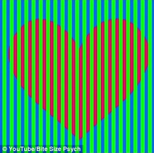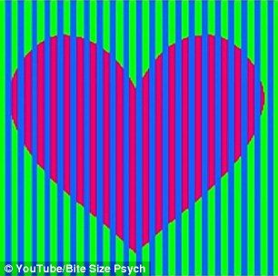 Las barras azules que rodean al primero hacen que el corazón parezca púrpura, mientras que las barras verdes que rodean al siguiente hacen que el corazón parezca naranja.