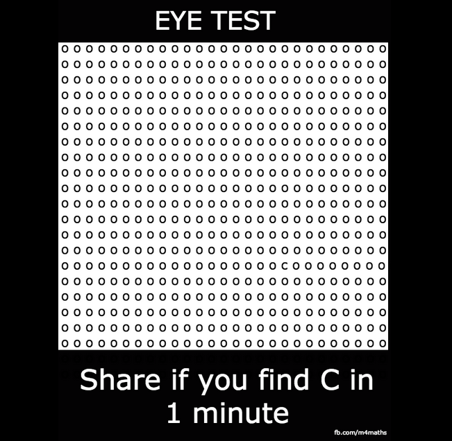 El sitio especializado M4maths compartió en su página de Facebook un reto cuyo fin es encontrar en pocos segundos un elemento diferente al resto. A diferencia de otras pruebas como la de encontrar al panda o el trébol, ésta tiene como objetivo encontrar la tercera letra del abecedario, la consonante C.